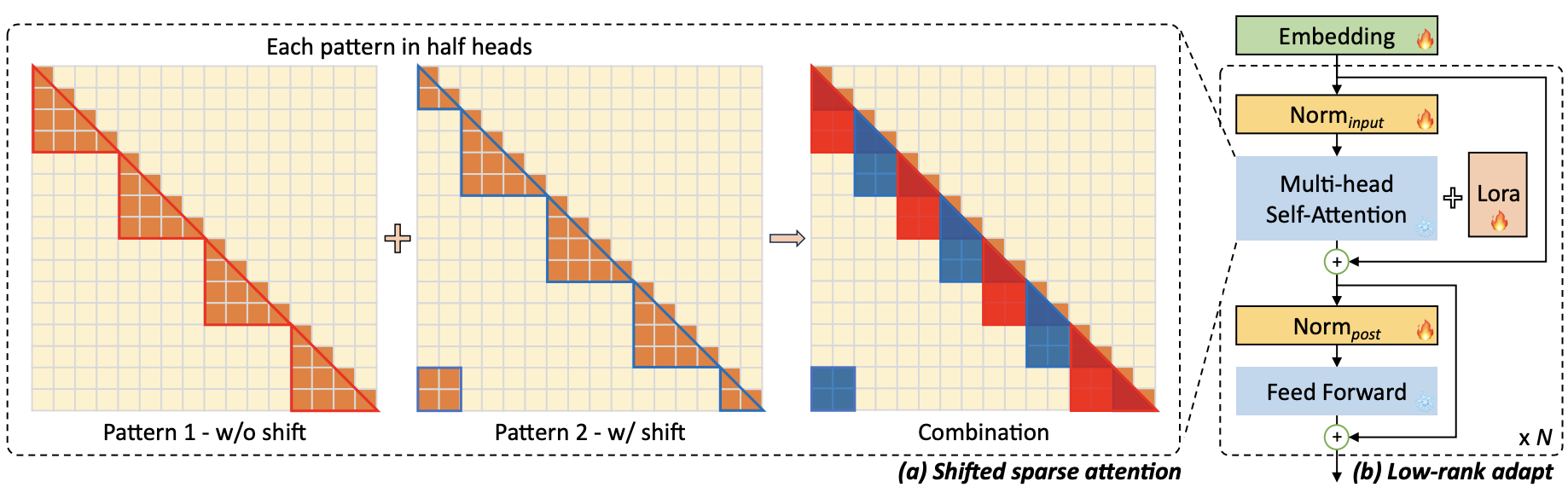 - LongLoRA cho phép hai tham số embedding và normalization thay đổi dựa trên dữ liệu đưa vào (trainable). Điều này có vai trò then chốt đối với việc mở rộng context và chỉ giới thiệu một số lượng tối thiểu các tham số có thể training.