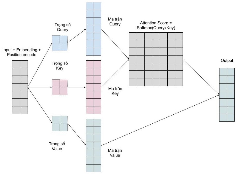 - Bước 3: Tính output. Nhân attention weights với ma trận value. Điều này có nghĩa là chúng ta biểu diễn một từ bằng trung bình có trọng số (attention weights) của ma trận value.