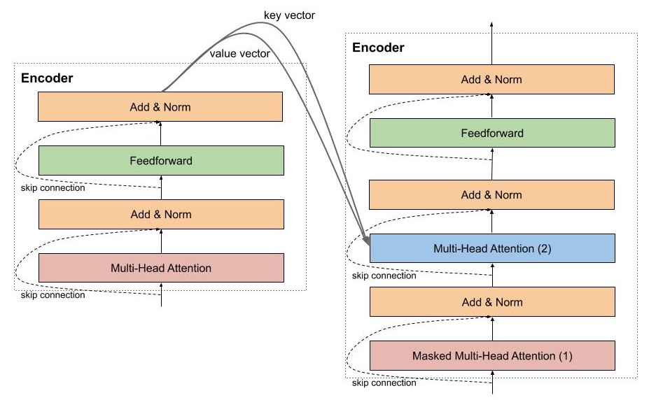Trong decoder còn có một multi head attention khác có chức năng chú ý các từ ở mô hình encoder, layer này nhận vector key và value từ mô hình encoder, và output từ layer phía dưới. Đơn giản bởi vì chúng ta muốn so sánh sự tương quan giữa từ đang được dịch với các từ nguồn.
