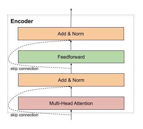 Encoder của mô hình transformer có thể bao gồm nhiều encoder layer tượng tự nhau. Mỗi encoder layer của transformer lại bao gồm 2 thành phần chính là multi head attention và feedforward network, ngoài ra còn có cả skip connection và normalization layer.