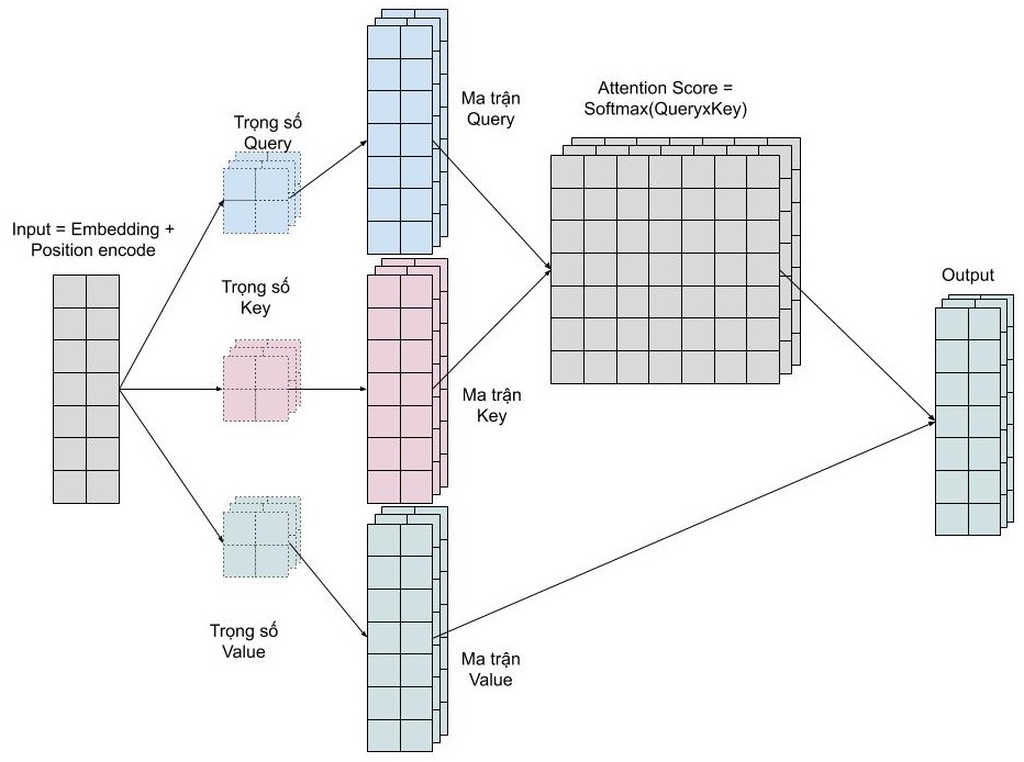 Đầu tiên, với môi từ chúng ta cần tạo ra 3 vector: query, key, value vector bằng cách nhân ma trận biểu diễn các từ đầu vào với ma trận học tương ứng.