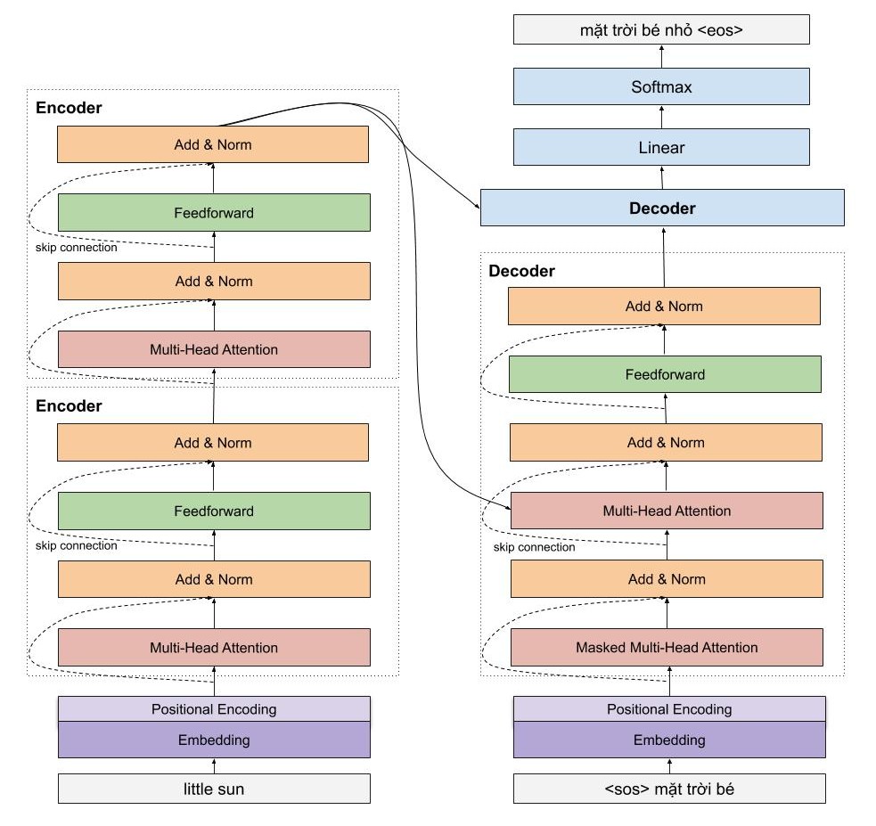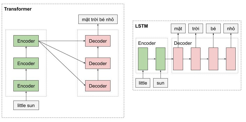 Trong ví dụ ở dưới, encoder của mô hình transformer nhận một câu tiếng anh, và encode thành một vector biểu diễn ngữ nghĩa của câu little sun, sau đó mô hình decoder nhận vector biểu diễn này, và dịch nó thành câu tiếng việt mặt trời bé nhỏ