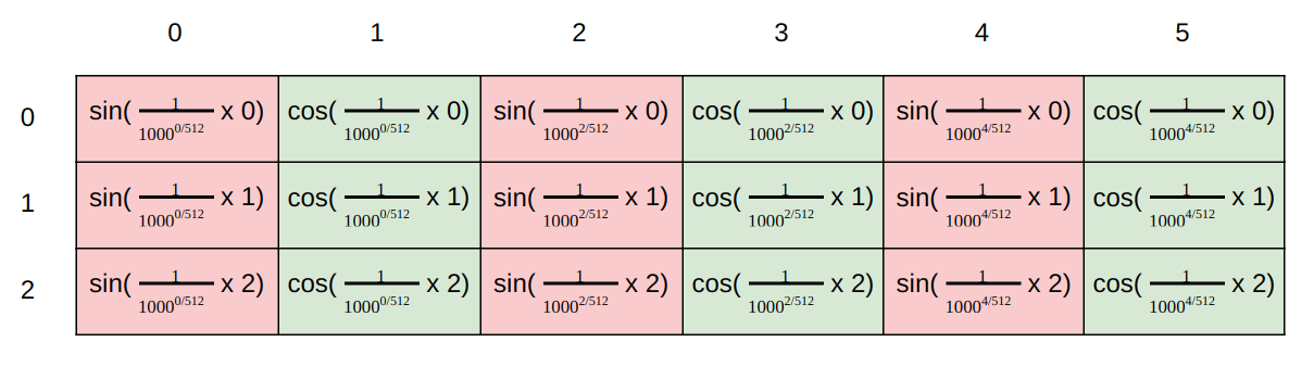 Trong công thức của tác giả đề xuất, các bạn cũng thấy rằng, hàm sin và cos có dạng đồ thị tần số và tần số này giảm dần ở các chiều lớn dần. Các bạn xem hình dưới, ở chiều 0, giá trị thay đổi liên tục tương ứng với màu sắc thay đổi liên tục, và tần số thay đổi này giảm dần ở các chiều lớn hơn.