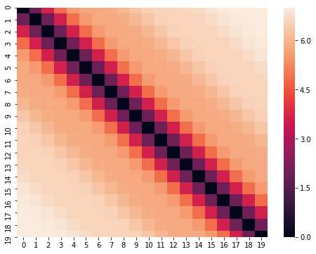 Chúng ta cũng có thể xem ma trận khoảng cách của các vector biểu diễn vị trí như hình dưới. Rõ ràng, các vector biểu diễn thể hiện được tính chất khoảng cách giữa 2 từ. 2 từ cách càng xa nhau thì khoảng cách càng lớn hơn.